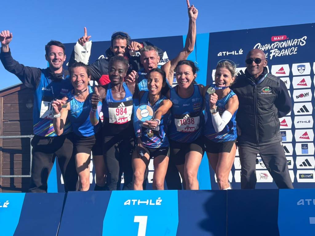 🏆La marseillaise a résonné lors de la montée sur la plus haute marche du podium de l’équipe Master féminine (calculée sur 3 athlètes) composée d’ Hanane HILI et de Céline PLASSERAUD toutes 2 du NCAA et de Virginie AUGER (7ème M3F) de l’ERAA pour ce titre de Championnes de France.
