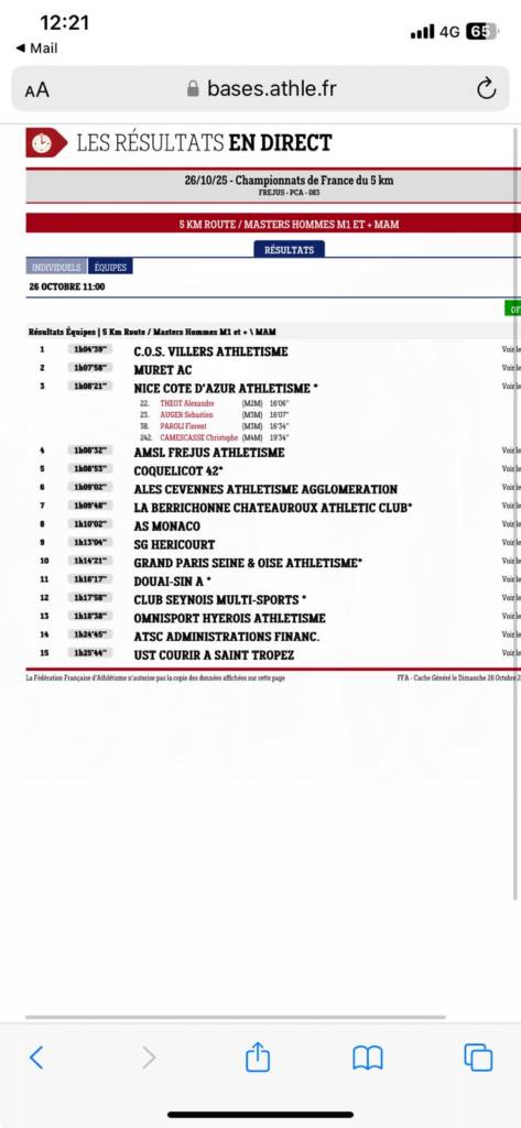 🥉Les Masters masculins, Alexandre THEOT 7ᵉ M2M en 15’55 , Sébastien AUGER 4ᵉ M3M en 16’06 tous 2 de l’ERAA et Florent PAROLI, Christophe CAMESCASSE du NCAA terminent à la 3ème place par équipes (calculée sur 4 athlètes)